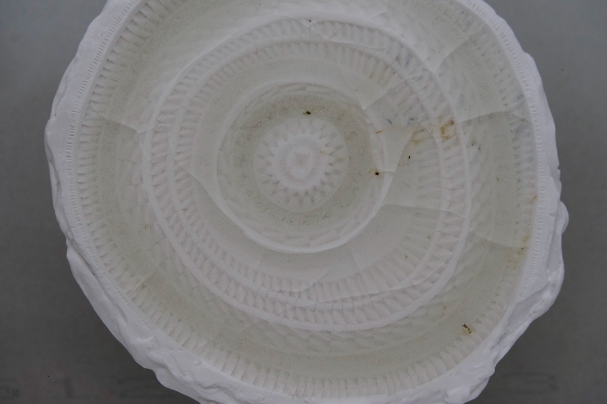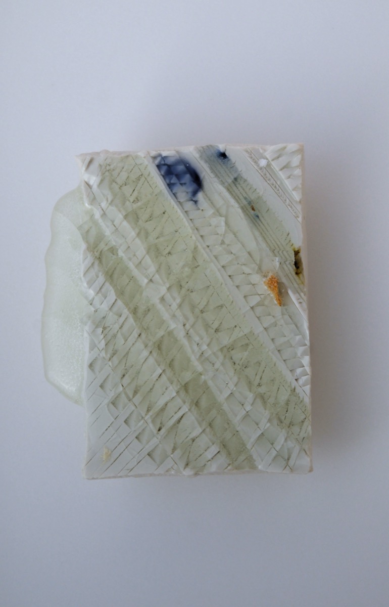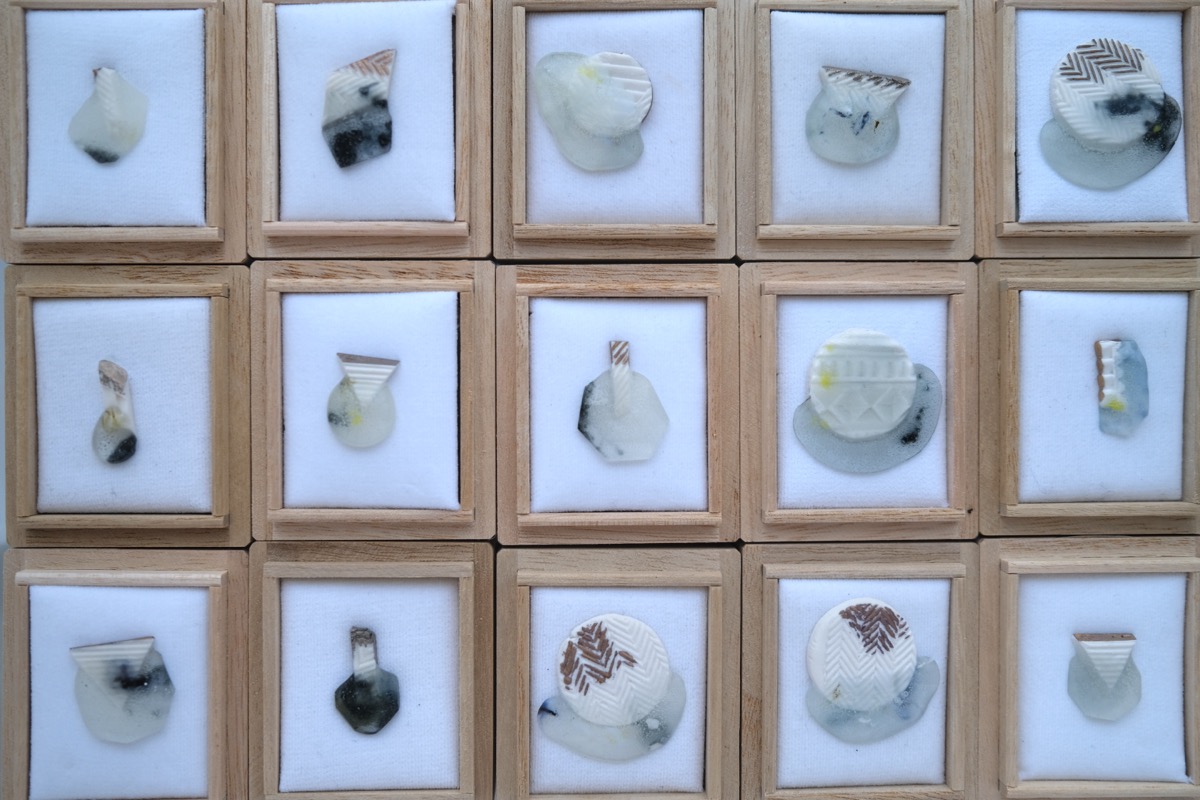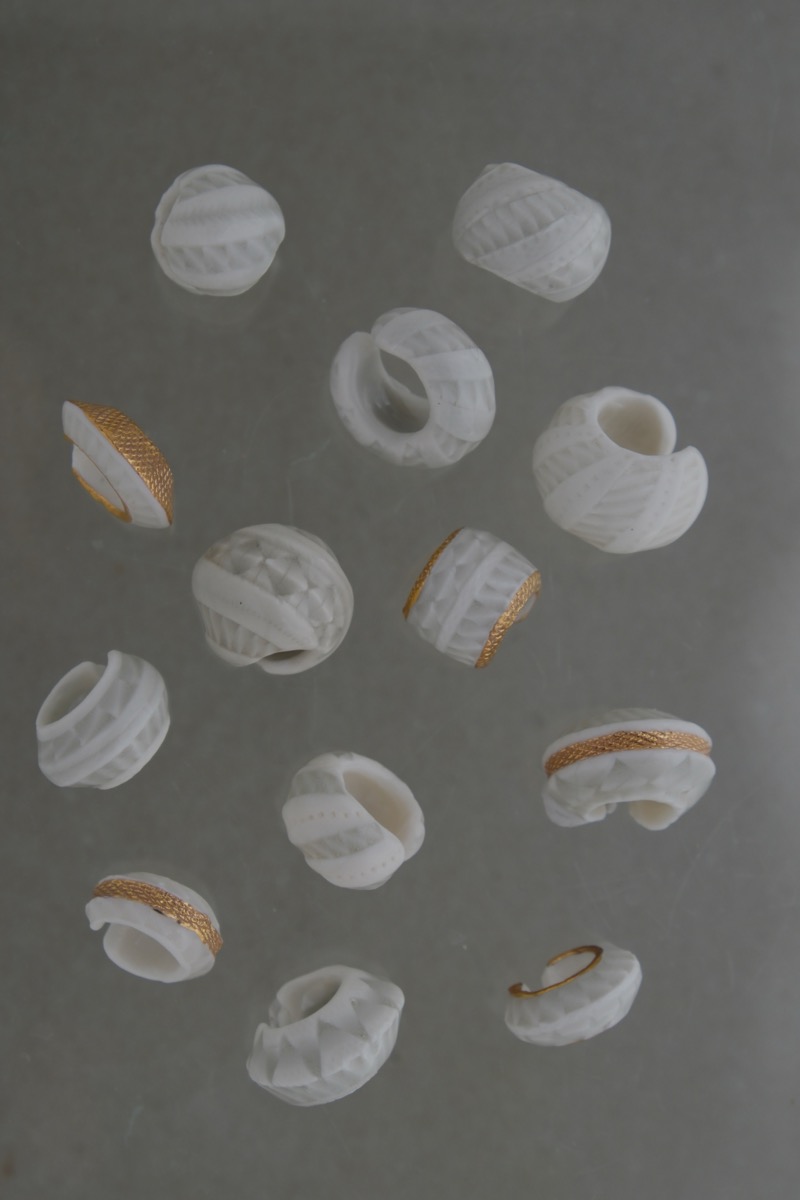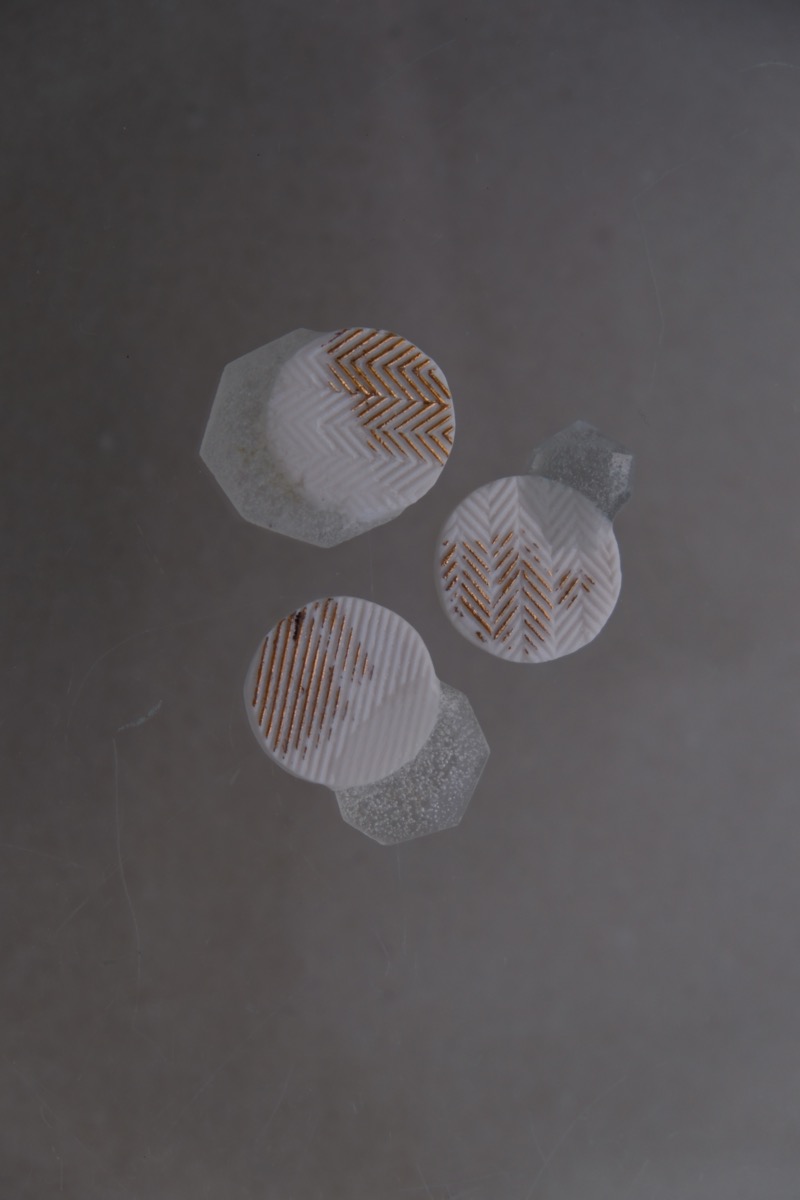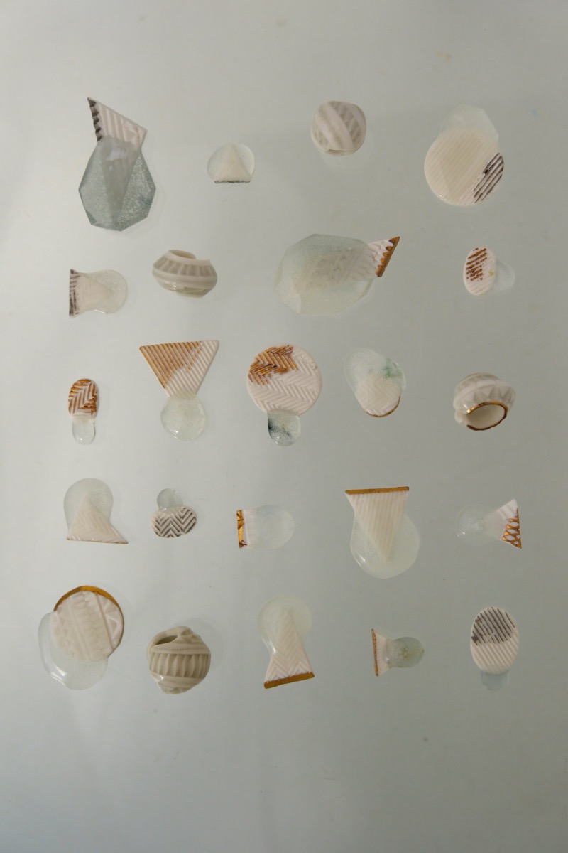 それを宝石と組成の近い陶磁器という素材に写し取り、反復的なパターンを彫り上げイメージを析出させて生まれるのは、新しい結晶体。