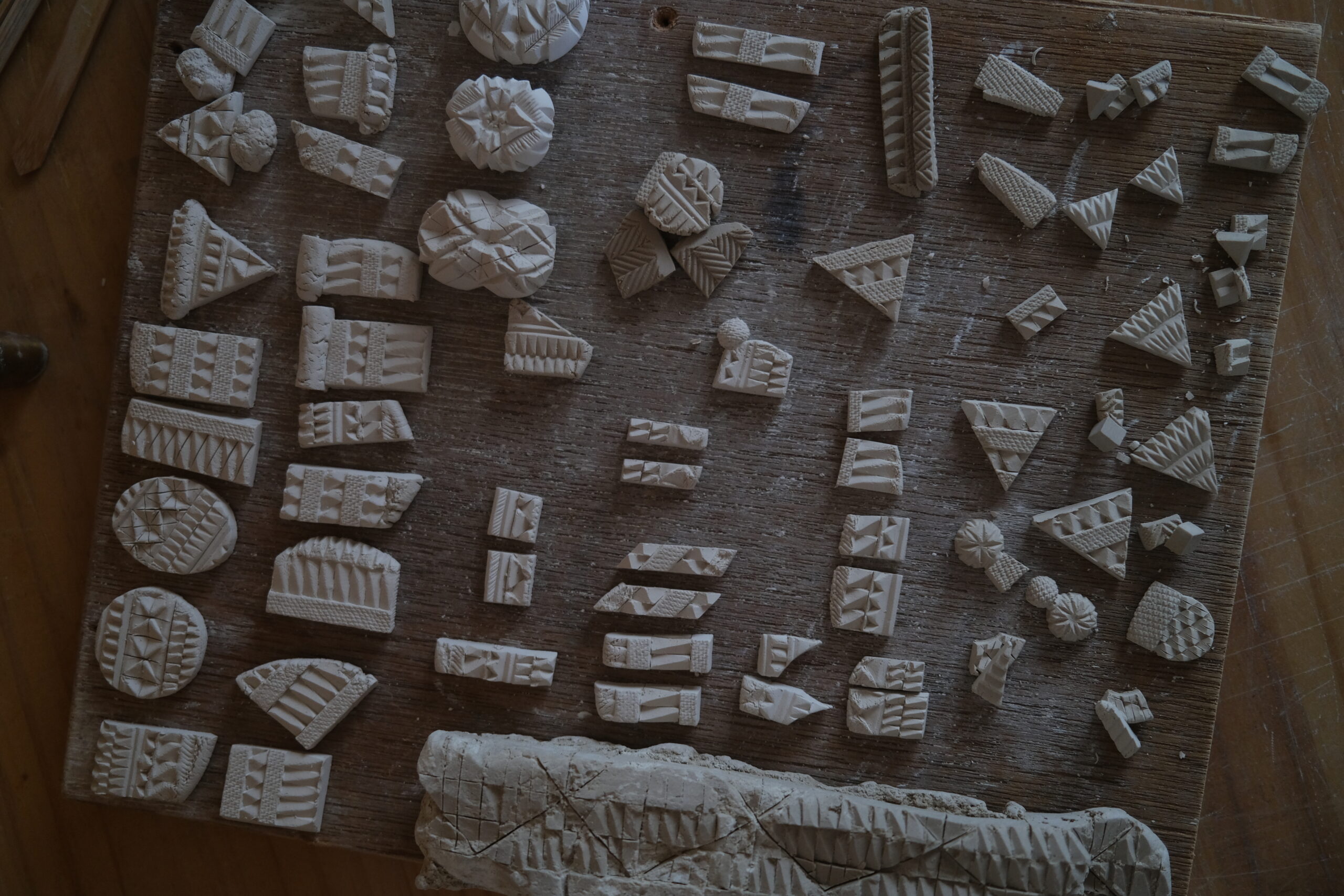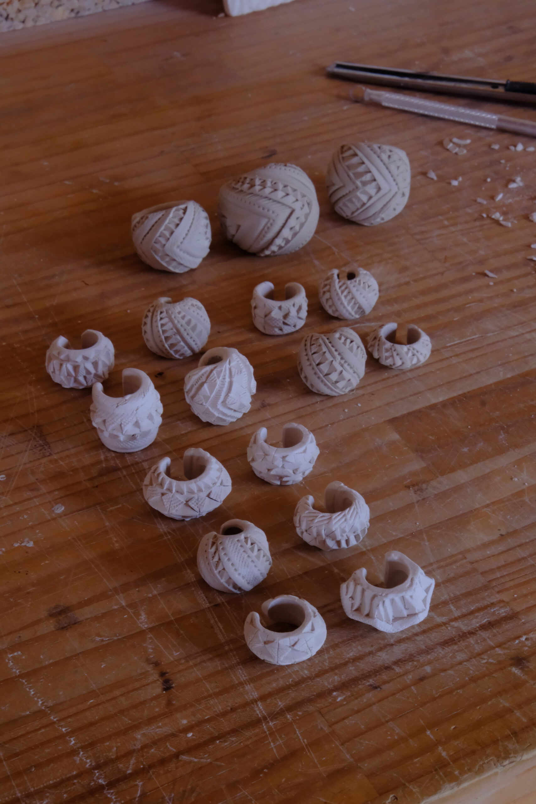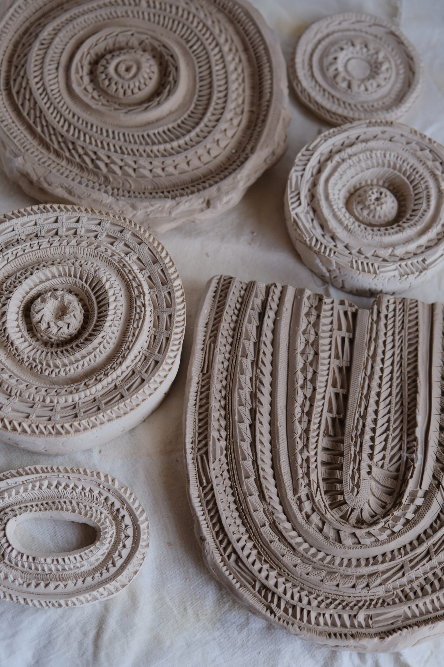 細かな線や面を繰り返し彫り重ねたり、焼き上げによる変化を活かしたりしながら、時の流れや人々の営みの積層を映し出すことができたらと考えています。